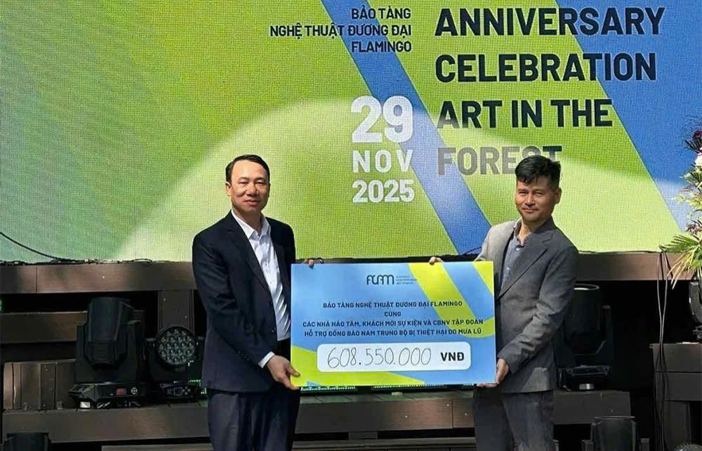 Tại lễ kỷ niệm năm nay, nghệ sĩ và cán bộ Flamingo đã quyên góp hơn 608 triệu đồng hỗ trợ đồng bào bị ảnh hưởng bởi bão lũ, thiên tai.