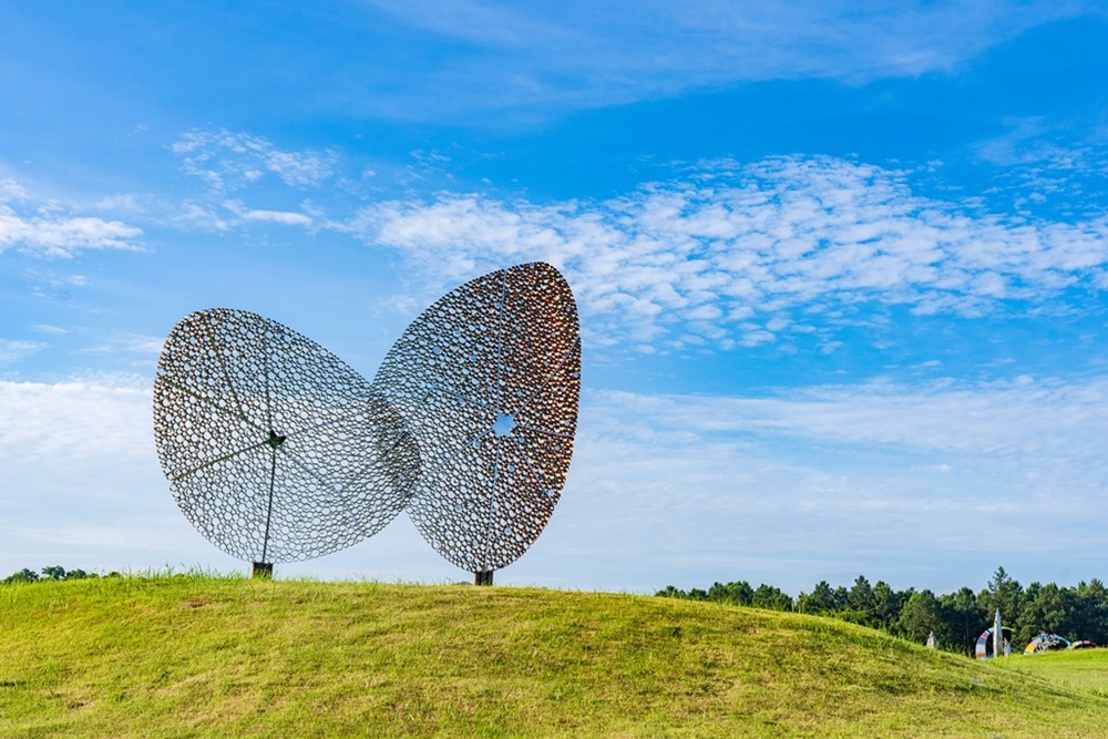 Sen là sự hòa trộn giữa chất liệu thép không gỉ và nhịp gấp của giấy, tạo nên chuyển động nhẹ bẫng giữa rừng thông. Màu sắc rực rỡ giúp tác phẩm đón lấy ánh sáng tự nhiên, mang lại một trạng thái thị giác rất “nghỉ dưỡng giữa thiên nhiên”, đúng tinh thần của Đại Lải.