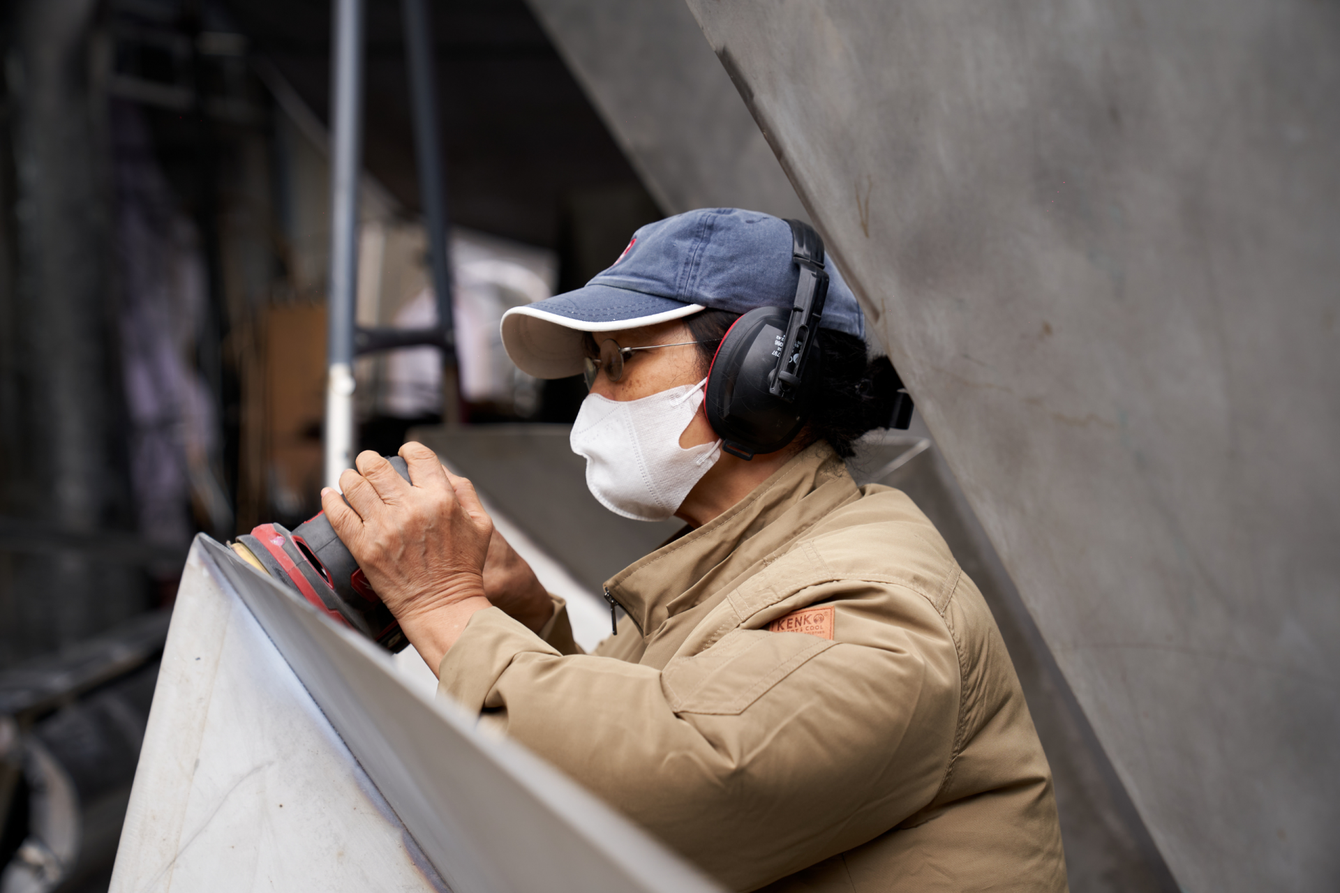Khi bước vào lao động sáng tác, Lê Thị Hiền thể hiện một trạng thái khác: quyết liệt và đầy dứt khoát. Hình ảnh người phụ nữ nhỏ bé trong bộ đồ bảo hộ, tóc búi gọn, đội mũ lưỡi trai, đeo khẩu trang, tay cầm máy mài làm việc giữa tiếng ồn ã, trở thành một lát cắt thuyết phục về tinh thần tận hiến với nghề.